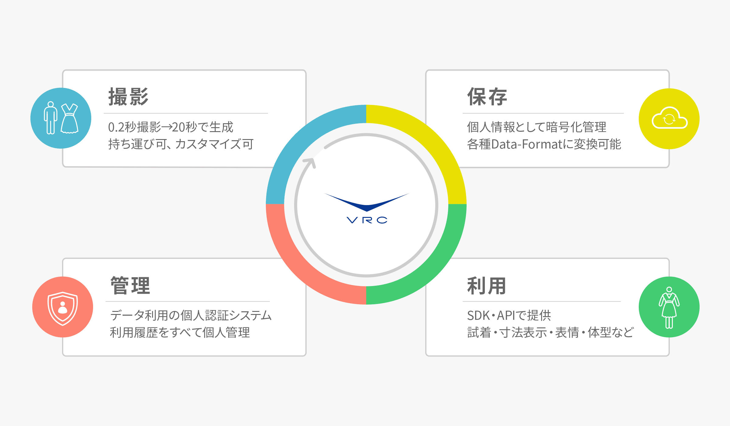 Ubiquitous Avatar Platform(ユビキタス アバター プラットフォーム)構想とはVRCでは3Dアバターを一つの情報として捉え、エンドユーザーがその3Dアバター及び付随する情報を生活の様々な場面(アパレル・ヘルスケア・コミュニケーションなど)で利活用するために、業界やサービスの垣根を越えた安全に自由に3D情報を利活用できるバックエンド環境を実現することをUbiquitous Avatar Platform構想として位置付けています。