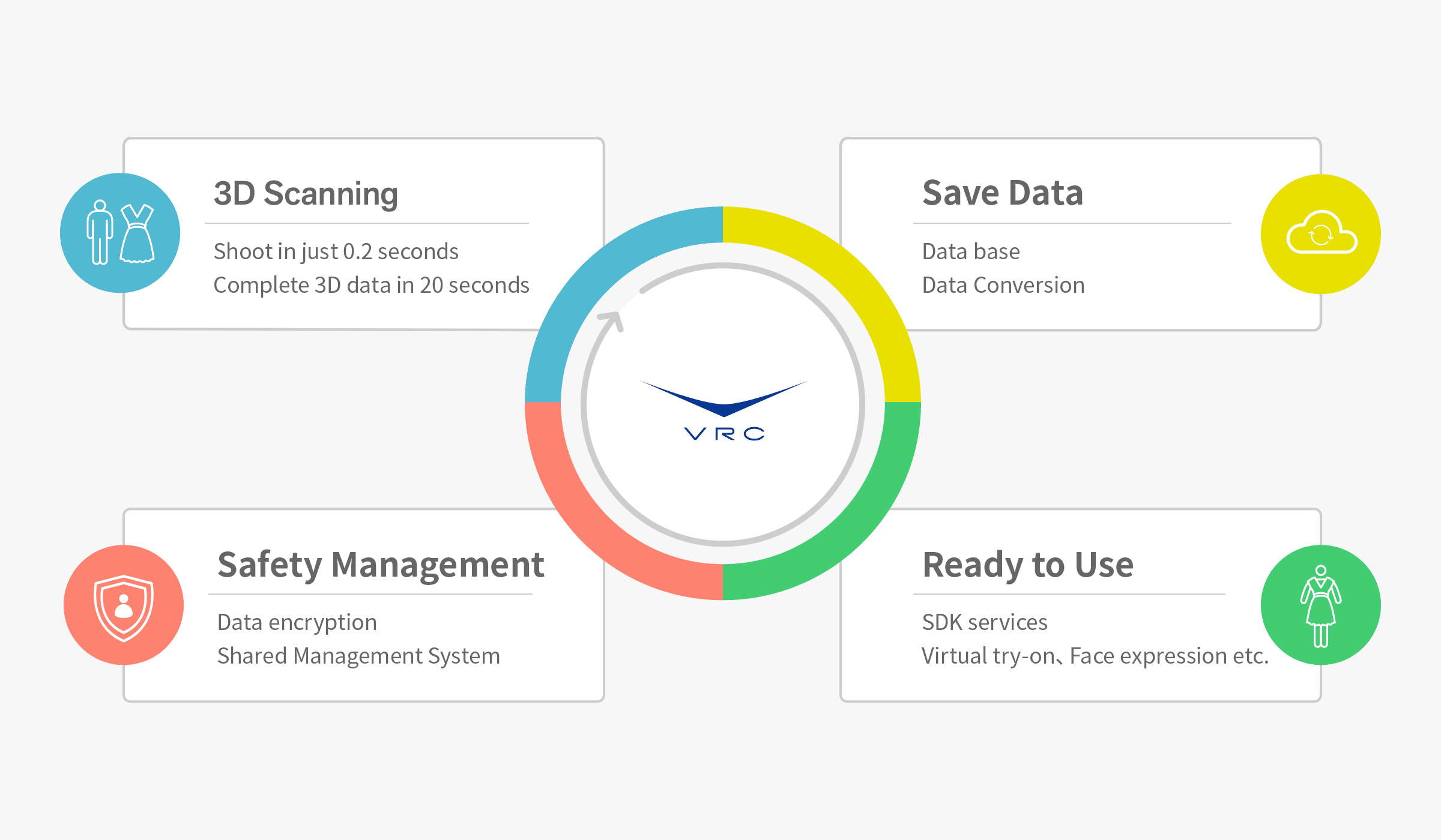 In VRC, 3D Avatar is regarded as one piece of information, and end users utilize the 3D Avatar and accompanying information in various situations of their lives (apparel, healthcare, communication, etc.). In order to do so, we have positioned the Ubiquitous Avatar Platform concept as a back-end environment that allows 3D Human information to be used safely and freely across industry and service boundaries.